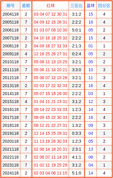 双色球积年第118期奖号分区详备数据