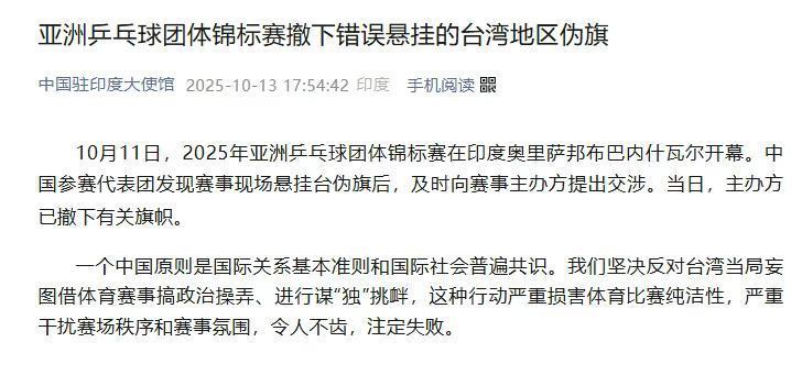 10月11日,2025年亚洲乒乓球团体锦标赛在印度奥里萨邦布巴内什瓦尔开幕。中国参赛代表团发现赛事现场吊挂台伪旗后,实时向赛当事者持方提议交涉。当日,主持方已撤下干系旗子。 ![]() 一个中国原则是外洋关系基本准则和外洋社会大批共鸣。咱们刚烈反对台湾当局妄图借体育赛事搞政事操弄、进行谋“独”寻衅,这种行为严重挫伤体育比赛白皙性,严重搅扰赛场步骤和赛事氛围,令东说念主不齿,注定失败。 起首:看台海举报/反映","del":0,"gnid":"94a381c0c355b34dd","img_data":[{"flag":"2","img":[{"desc":"","height":"341","title":"","url":"http://p9.img.360kuai.com/t11508c75c85f91fb6bdd691bc4.jpg","width":"728"}]}],"original":0,"pat":"art_src_6,fts0,sts0","powerby":"cache","pub_time":1760372880000,"pure":"","rawurl":"http://zm.news.so.com/69b00cf92a994f31a37c60fc11be03e7","redirect":0,"rptid":"de096599a465cbf8","rss_ext":[],"s":"t","src":"海峡导报","tag":[{"clk":"ksport_1:乒乓球","k":"乒乓球","u":""}],"title":"亚洲乒乓球团体锦标赛撤下特殊吊挂的台湾地区伪旗","type":"zmt","wapurl":"http://zm.news.so.com/69b00cf92a994f31a37c60fc11be03e7","ytag":"体育:乒球","zmt":{"brand":{},"cert":"《海峡导报社》官方账号","desc":"“海峡导报”由厦门海峡导报社运营,主打台海新闻","fans_num":602425,"id":"2862029998","is_brand":"0","name":"海峡导报","new_verify":"4","pic":"https://p0.img.360kuai.com/t01e03b60b190d8cc2e.jpg","real":1,"textimg":"https://p9.img.360kuai.com/bl/0_3/t017c4d51e87f46986f.png","verify":"0"},"zmt_status":0}","errmsg":"","errno":0} |