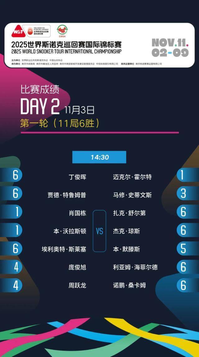 下昼赛段,两场焦点战同步开打。1号球桌,中国斯诺克领军东说念主物丁俊晖迎战迈克尔・霍尔特。2号球桌,寰宇名依次一的贾德・特鲁姆普对阵马修・史蒂文斯。首轮比赛中,丁俊晖现象火热,零封敌手的同期轰出 4 杆百分杆,今天他无间了精采的现象,首局就打出单杆134分,之后有贯串打出一杆破百和三杆50+得到5比0逾越。固然霍尔特在第六局赈济一个赛点,但在第七局丁俊晖打出单杆86分制胜,晋级32强。下一轮他的敌手是打败庞俊旭的海菲尔德。贾德·特鲁姆普在昨日的比赛中虽最终取胜但历程相对费事,今天比赛寰宇第一似乎又找回现象,打出一杆破百和三杆50+,马修·史蒂文斯打出两杆50+,上半场特鲁姆普得到3-1的逾越,并在中场休息后打出单杆105分连胜两局得到赛点,随后史蒂文斯连追两个赛点,第九局特鲁姆普屡次上手告成。最终,贾德·特鲁姆普6-3淘汰马修·史蒂文斯,告成晋级。